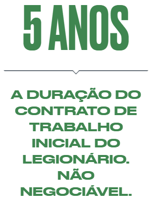 O contrato inicial é de 5 anos. No final deste primeiro contrato, o legionário pode optar pela prossecução da carreira por meio de contratos sucessivos cuja duração varia entre 6 meses e 5 anos. Servindo com determinação e de acordo com as aptidões, uma carreira de gestão pode ser oferecida a você a partir de 3 anos de serviço!